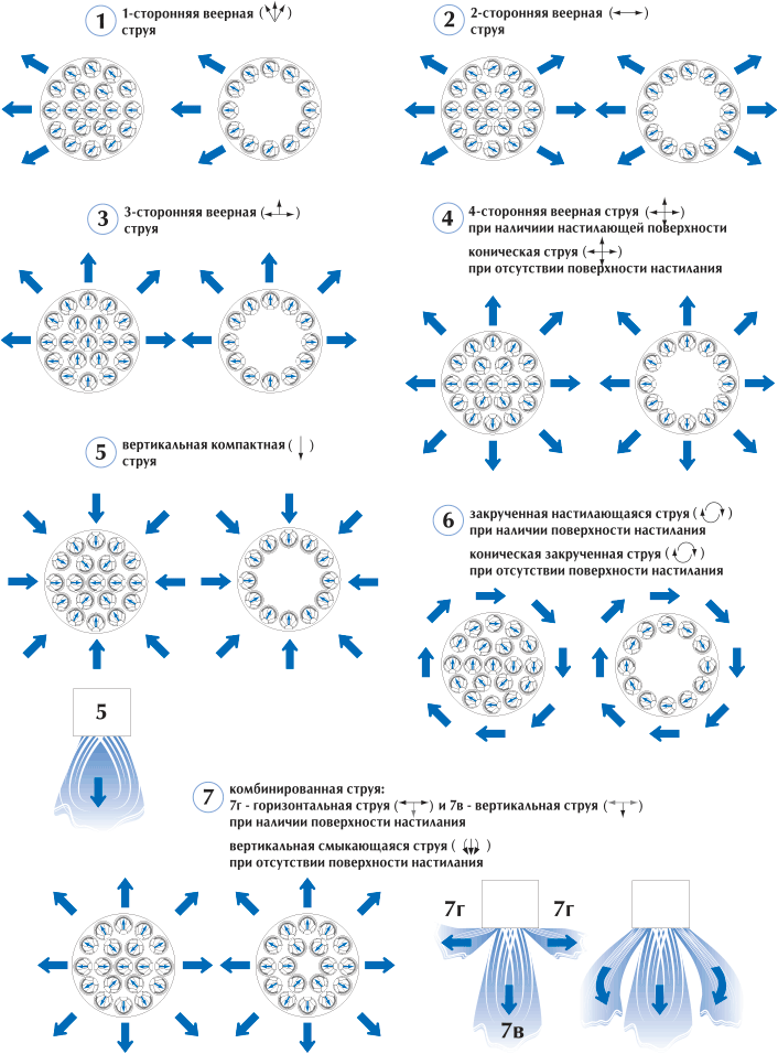 Настилающаяся струя, формируемая 1ВКТ, 1ВКТР, 2ВКТ, 2ВКТР, дальнобойна и может быть реализована различными способами. Поворотом ячеек струя может быть направлена в одну, две, три или четыре стороны. Таким образом, 1ВКТ, 1ВКТР, 2ВКТ, 2ВКТР может применяться и как центральный, и как угловой, и как односторонний воздухораспределитель, что позволяет реализовать требуемую систему воздухораспределения одним видом изделий, не внося во внешнее оформление помещения беспорядочного многообразия.