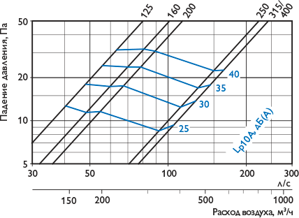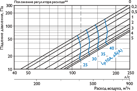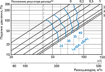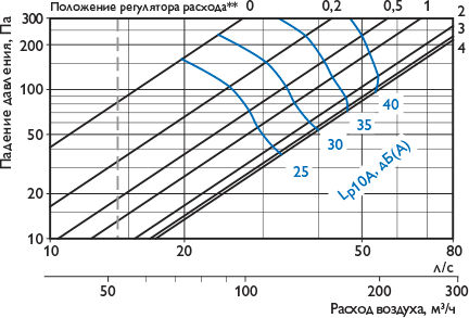 Lp10A, дБ(А) – уровень звука (корректированный уровень звукового давления для помещения с эквивалентной площадью звукопоглощения 10 м2) определяется по диаграмме;
