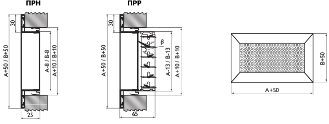 Перфорированные решетки ПРН, ПРР предназначены для подачи и удаления воздуха системами вентиляции и кондиционирования в помещениях различного назначения. Кроме того, решетки могут быть установлены в отопительных каналах каминов, а также в виде декоративных панелей для приборов отопления. Решетки ПРН представляют собой раму прямоугольной формы с установленной в ней перфорированной панелью. Коэффициент живого сечения перфорации Кж.с = 0,6. Решетки ПРР дополнительно оснащены регулятором расхода воздуха. Для очистки подаваемого или удаляемого воздуха решетки ПРН могут оснащаться воздушным фильтром c классом очистки G2, G3, M5, F7 или F9 (см. Приложение). Минимальный размер решетки 100х100 мм, максимальный — 1200х300 мм, с шагом 50 мм; возможно изготовление решеток с нестандартным шагом. При размере А(В)≥500 мм для обеспечения прочности конструкции в решётках устанавливаются стяжки. Корпус решетки изготавливается из алюминия, перфорированная панель — из стали и окрашивается методом порошкового напыления в белый цвет (RAL 9016). При изготовлении на заказ возможна окраска решеток в любой цвет по каталогу RAL. |